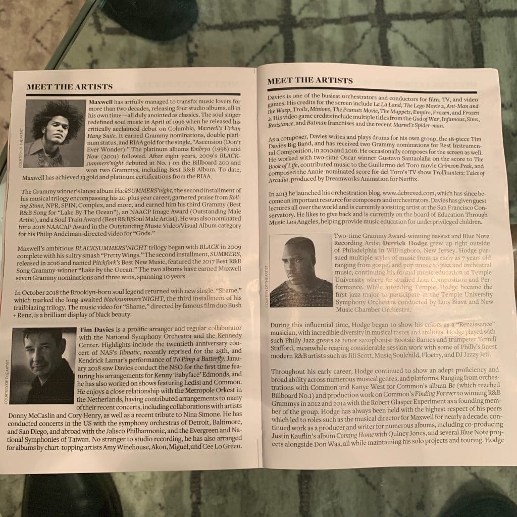 I just got back from Washington, DC. Maxwell sold out four shows at the Kennedy Center with the National Symphony Orchestra. This was my seventh collaboration with the NSO. Each time we learn how to do these things better and this time we really nailed it. It is tough to balance an artist, a band, and an orchestra. Maxwell was a pleasure to work with and he shared our vision of creating a truly unique experience. I had a great time arranging his music. All phones and recording were banned from the concert though, which was great for the show, but I have no cool photos or videos!